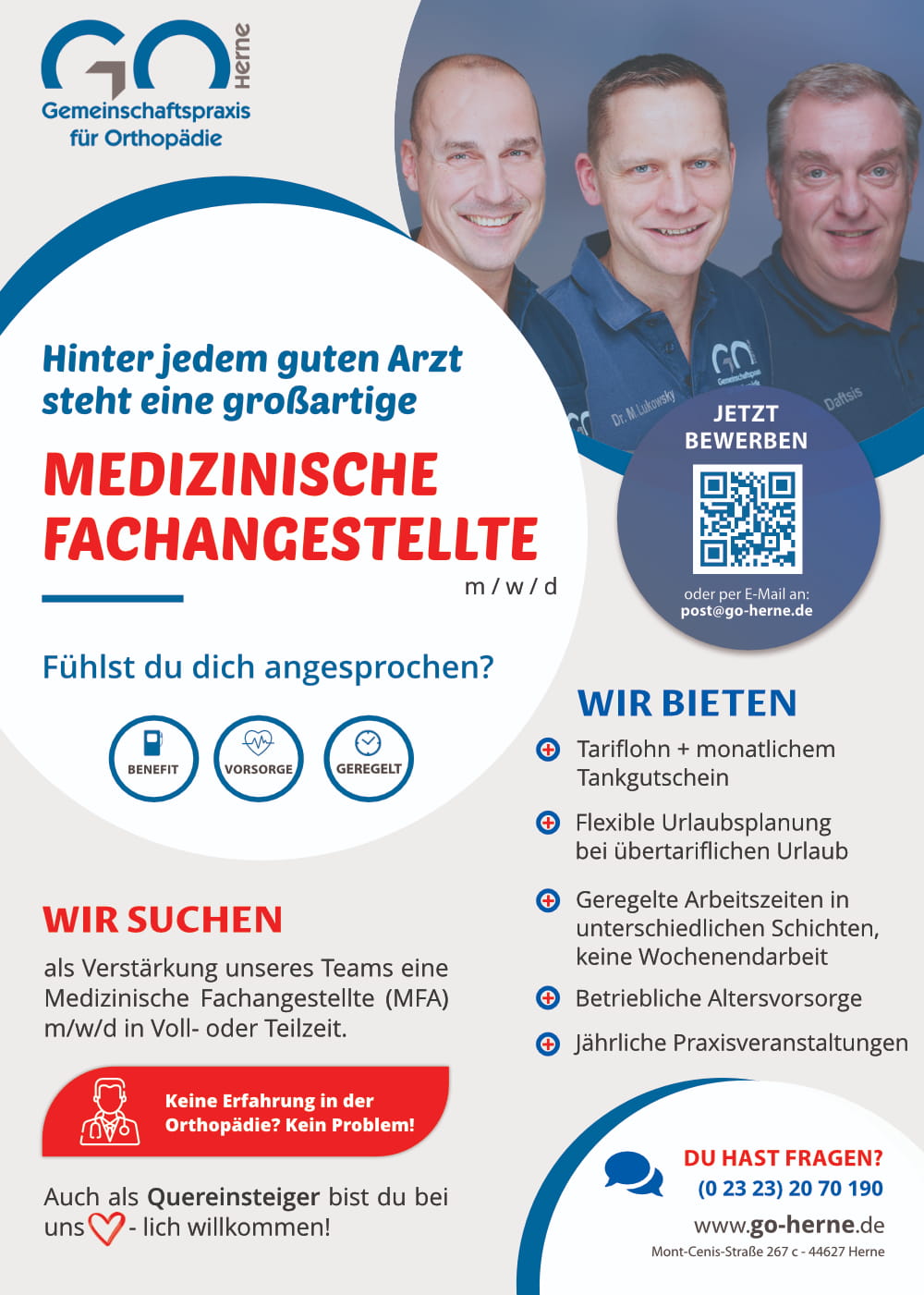 Bewerbungen schriftlich an GO-Herne - Gemeinschaftspraxis für Orthopädie, Mont-Cenis-Straße 267 c, 44627 Herne oder per E-Mail an Diese E-Mail-Adresse ist vor Spambots geschützt! Zur Anzeige muss JavaScript eingeschaltet sein!